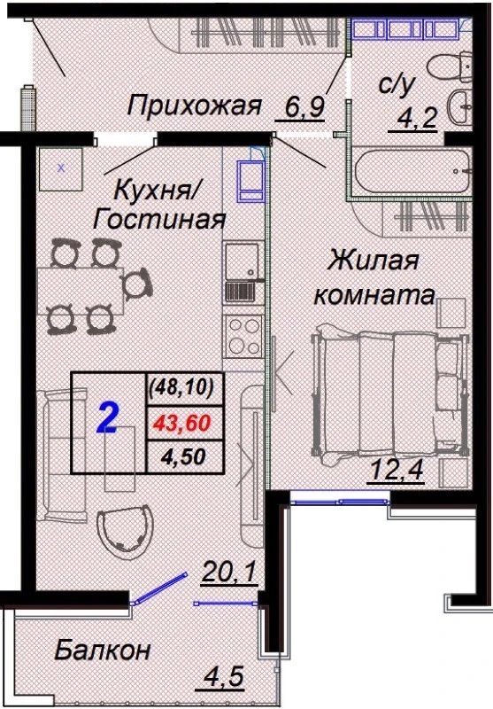 2-комнатная квартира 45.7 м² | ЖК Чайные Холмы